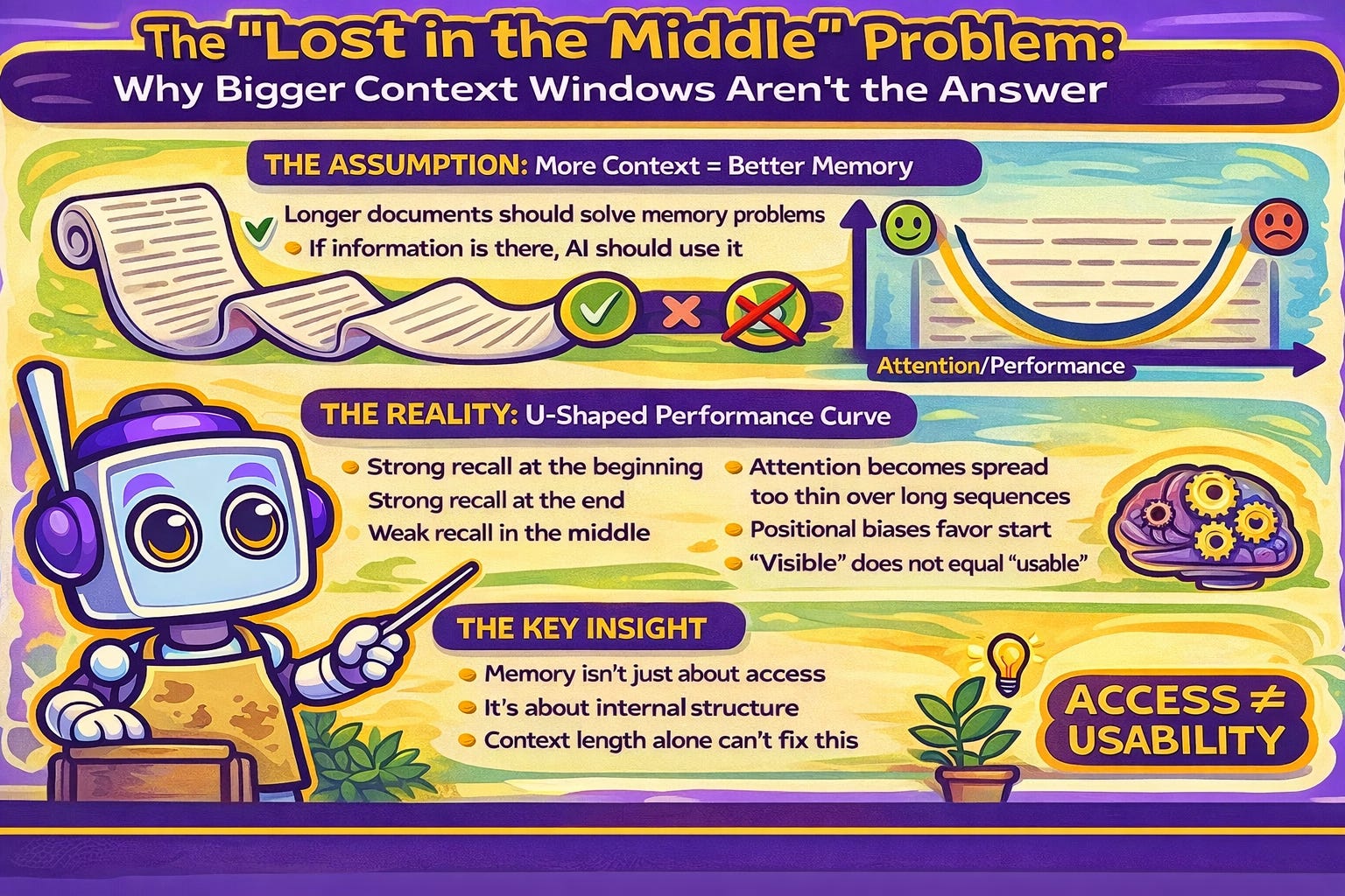 A common assumption is that giving an AI a longer document to read, a bigger context window, should solve its memory problems. If the information is right there in the text, it should be able to use it. But research shows this isn’t the case.