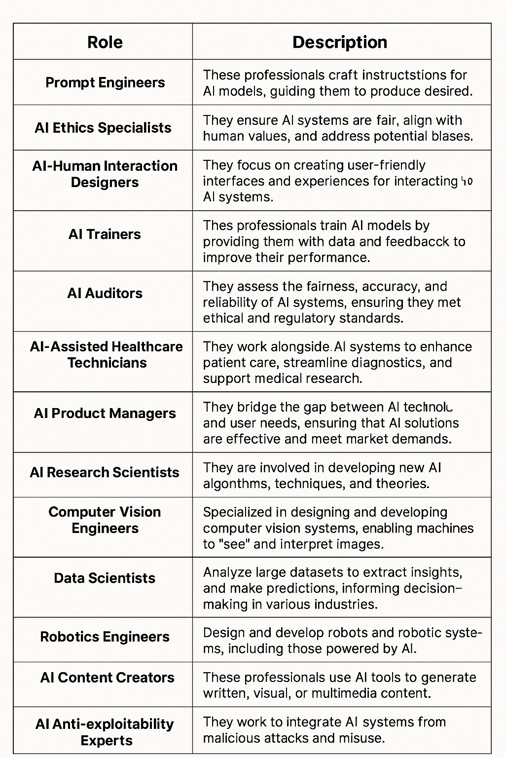 For every routine job AI automates, new kinds of roles are springing up. These include: